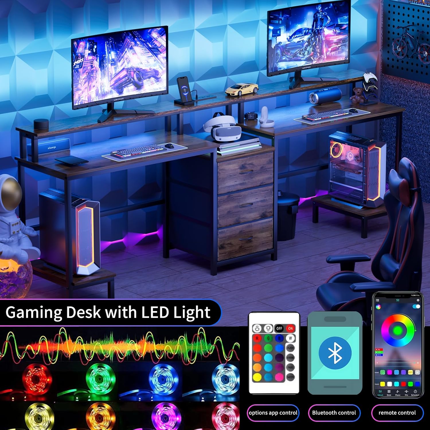 • 2 Person Desk with LED Lights & Charging Station – Long Desk for 2 with Storage Drawers, Monitor Riser, USB Ports & Outlets – Modern Study Table or Workstation for Home Office