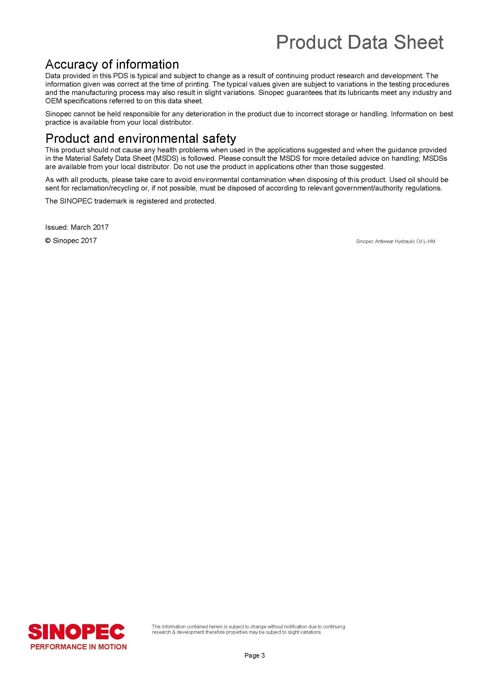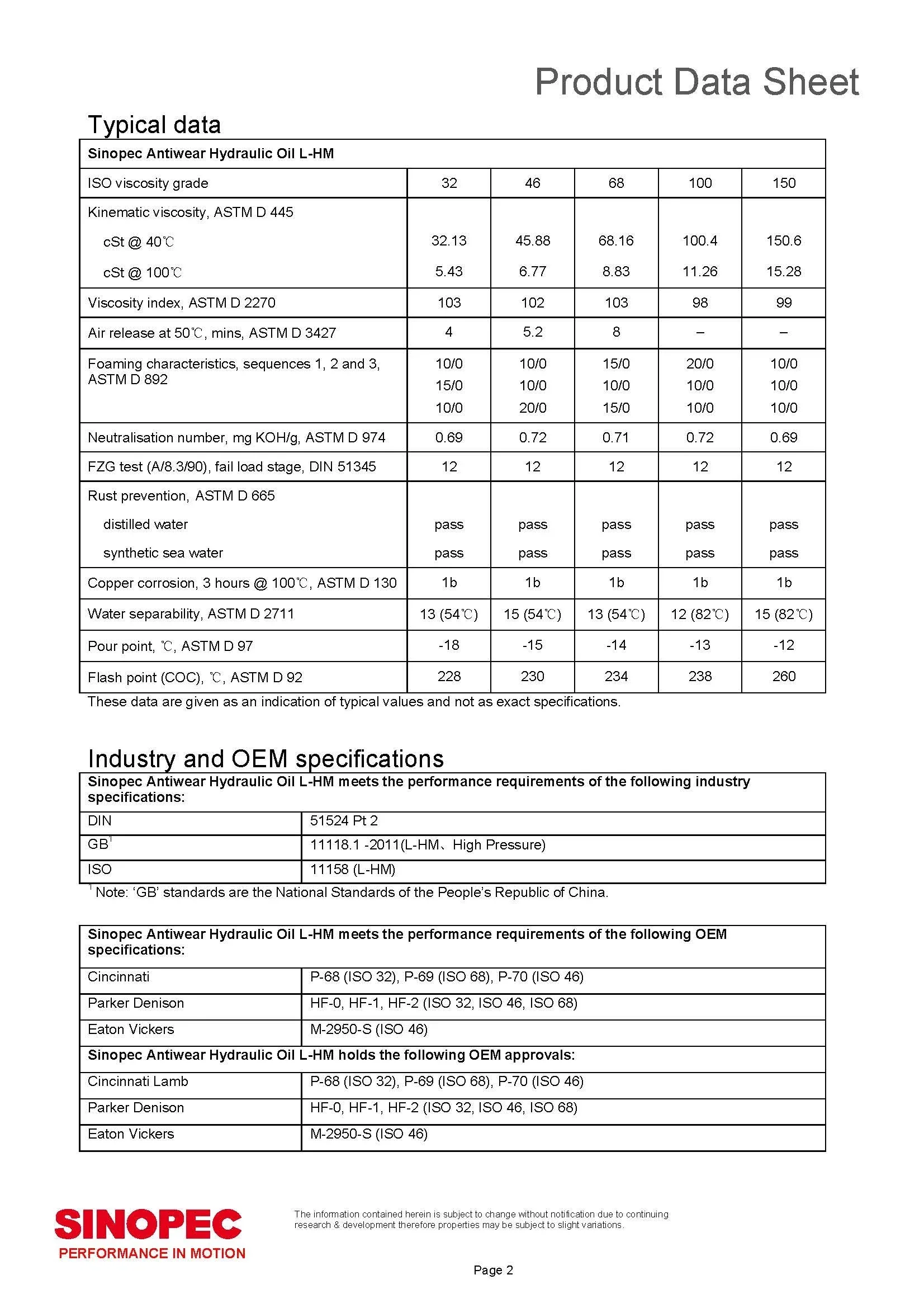 Pack Size: 55 Gallon Drum (200L Volume) Grade: ISO 46 Sinopec L-HM 46 Antiwear Hydraulic Oil is suitable for use in: Hydraulic applications in a wide variety of industrial. marine and mobile equipment . including. but not limited to plastic injection molding machines. presses. balers. Vane and gear pumps operating under high loads. as recommended by pump manufacturers. Severe service hydraulic systems. employing axial and radial piston pumps. as recommended by pump manufacturers. Features & Benefits High-quality base oils combined with multifunctional additive technology provide outstanding anti-wear properties. rust protection. low varnish and deposit formation. oxidation resistance. good antifoam properties. and fast air release properties. to protect and extend the life of hydraulic pumps and systems. Good hydrolytic stability and filterability. ensure optimum product life and performance. and prevent filter blocking. The wide selection of viscosity grades ensures that the optimum viscosity can be used for any hydraulic system operating temperature. Fully compatible with common seal materials usually found in hydraulic systems. to extend seal life and prevent fluid leakage. Sinopec L-HM 46 Anti-wear Hydraulic Oil meets or exceeds the performance requirements of the following OEM specifications: Cincinnati: P-70 (ISO 46) Parker Denison: HF-1 Eaton Vickers: M-2950-S (ISO 46)