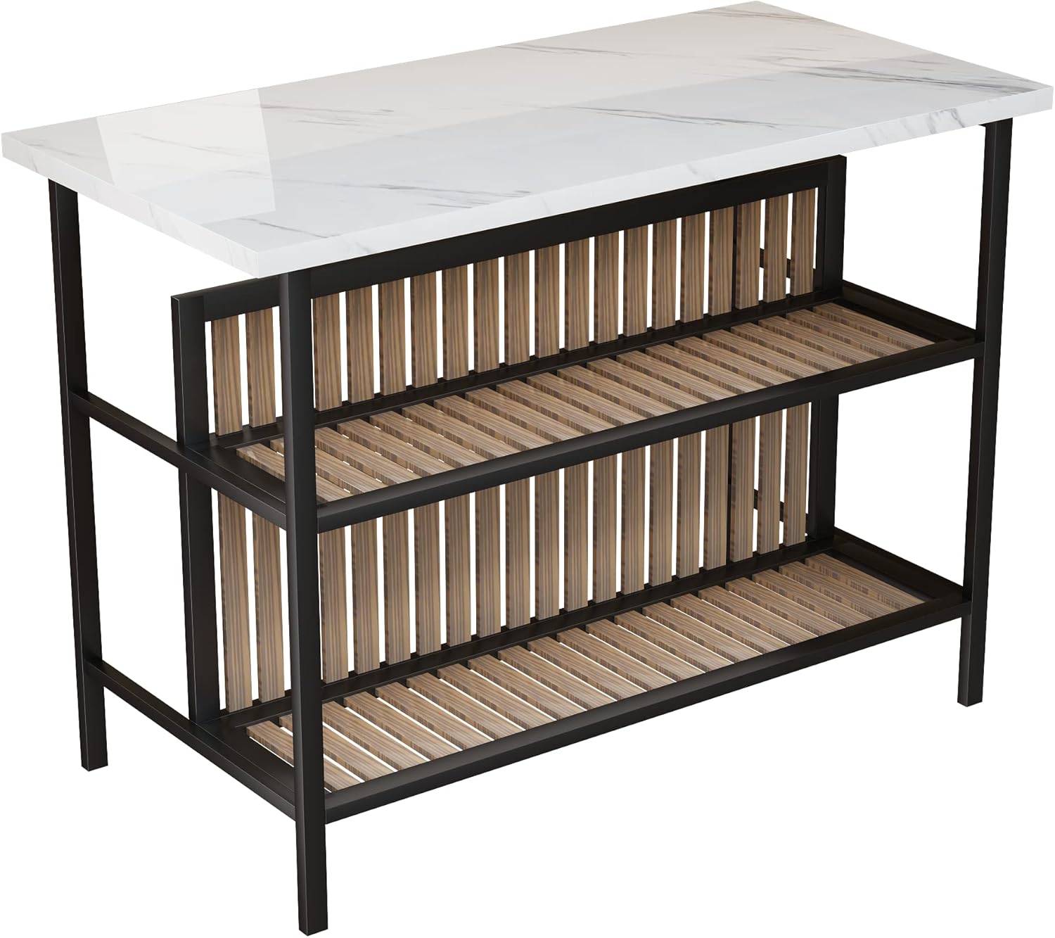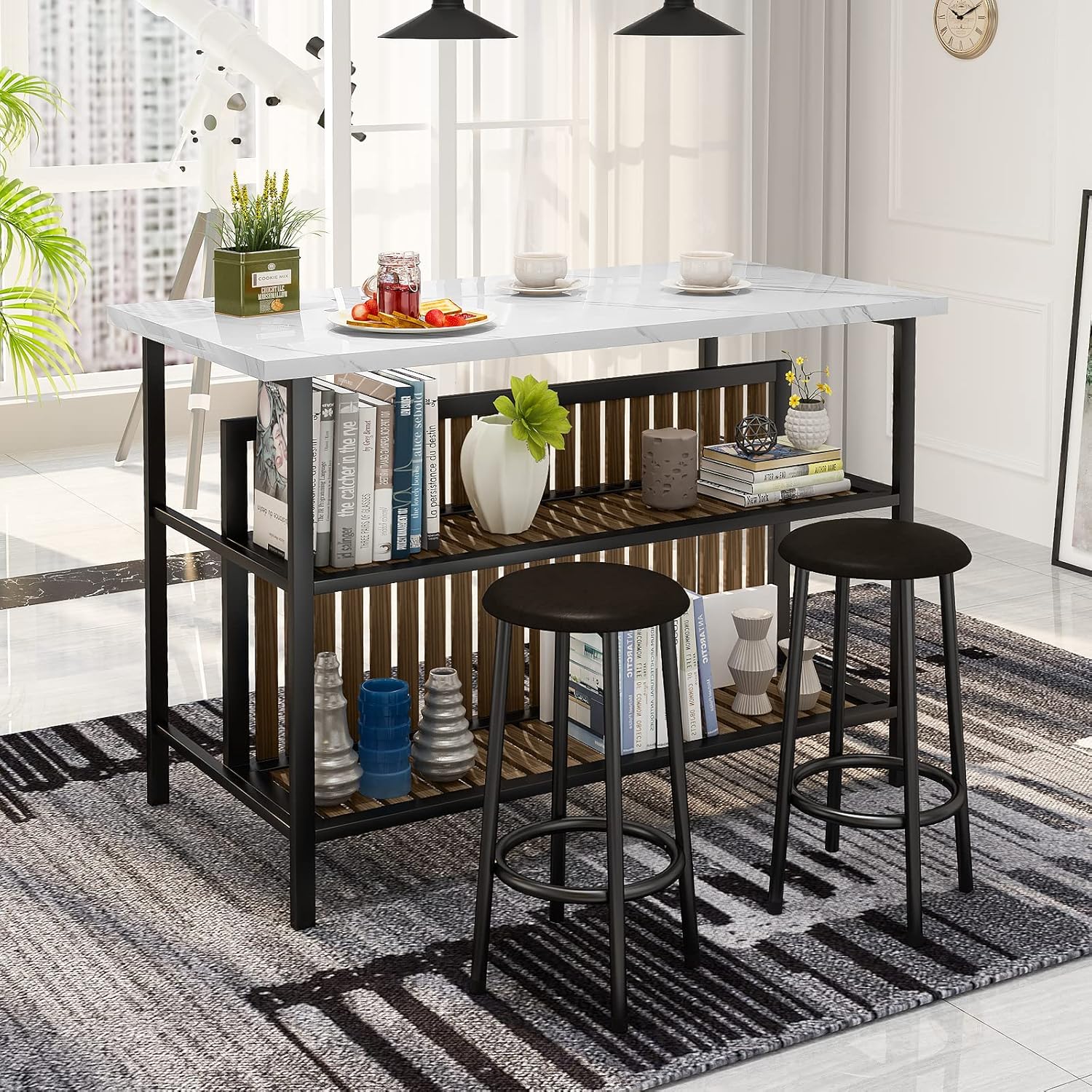 • Kitchen Island with Seating & Storage Shelf, Faux Marble Island Table for Kitchen, Modern Bar Table and Chairs Set for 2,Dining Table Set for Small Space,White