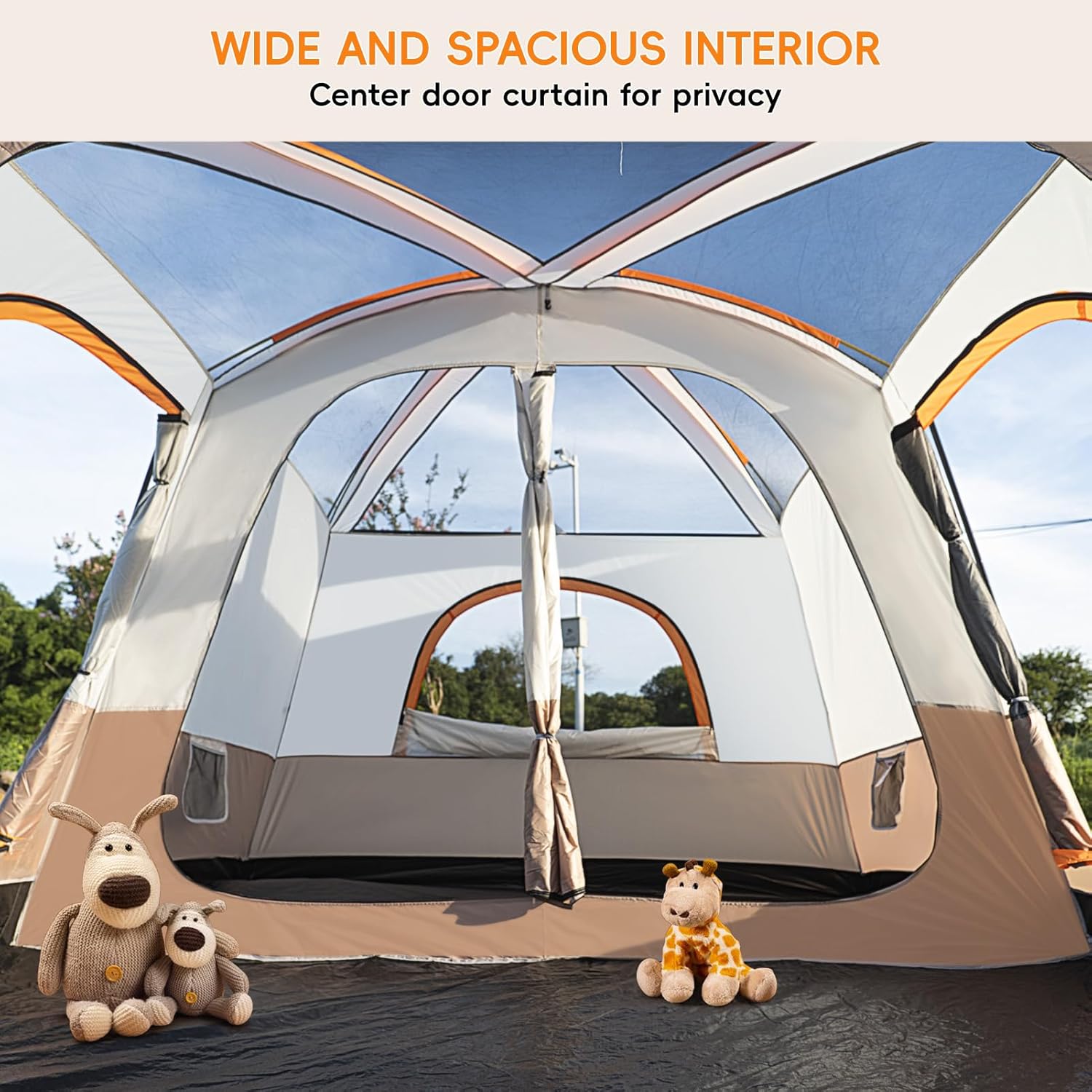 - Wide and Large Space: The camping tent can easily accommodate 4-6 people with two separate rooms for enhanced privacy. The size of the tent for camping is 10.8*6.9*6.1 ft, 72.8 inches at the highest point, which can accommodate 2 double sleeping pads or up to 6 sleeping bags, suitable for family adventures