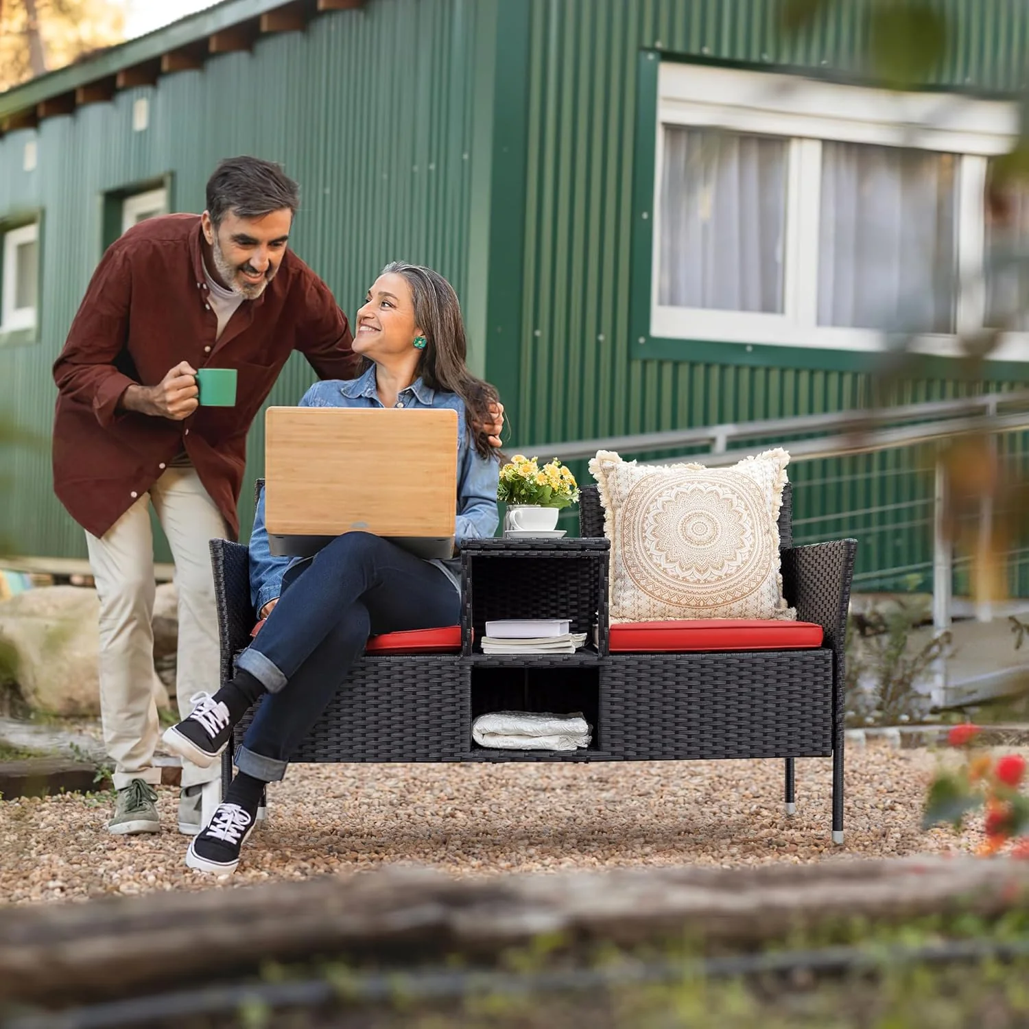 - Built-in Table & Storage: In the middle of the patio loveseat integrated storage compartment and small table. you can put some drinks. snacks. fruits within your reach in the tempered glass top. The small storage space below you can put books. tea cans and etc. This design saves your space and add more convenience.