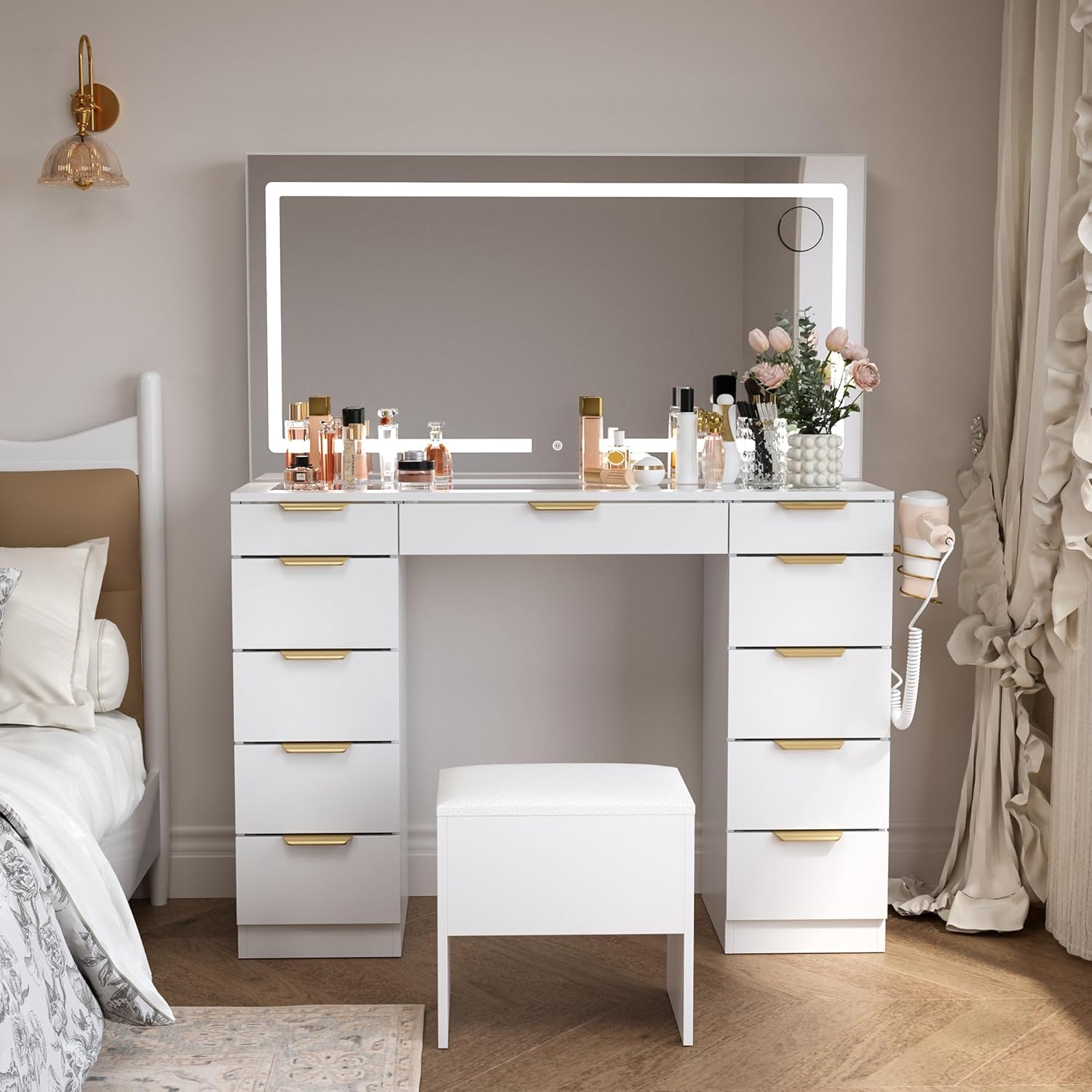 - Stylish Modern Design: With 11 organized drawers, gold handles, a metal hairdryer holder, and a glass tabletop, this makeup vanity offers a chic and functional design. Its large mirror adds a luxurious, contemporary touch to any room and makes a perfect gift