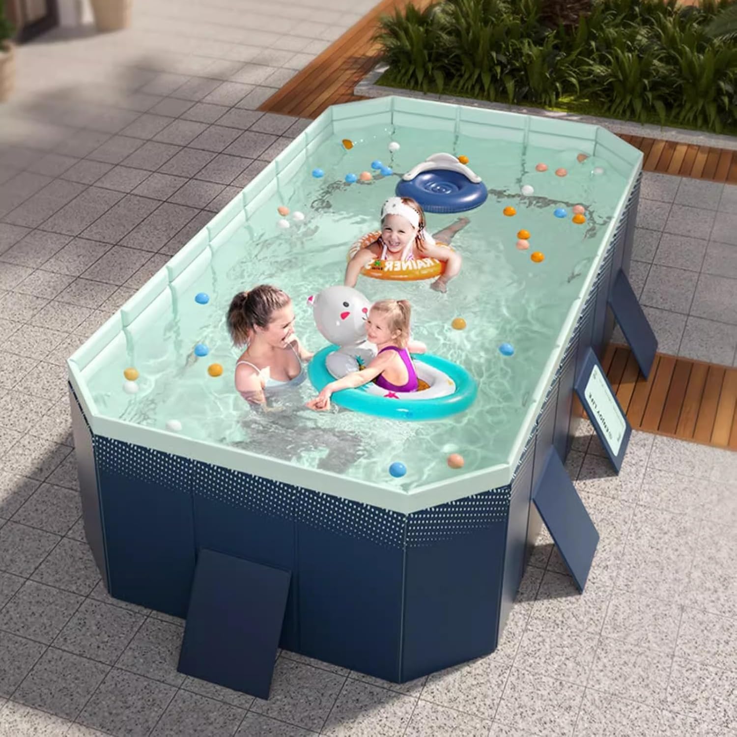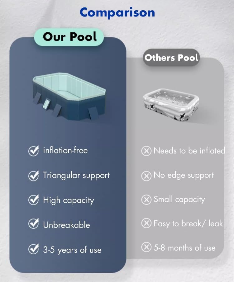 - ♨【Patented Pool Frame】 Each joint of the sealing and locking system is very strong. And the included triangular stabilizing support system on all four sides stabilizes multiple people playing in the fun pool. Each pool comes with 8 pieces of pool entertainment accessories.
