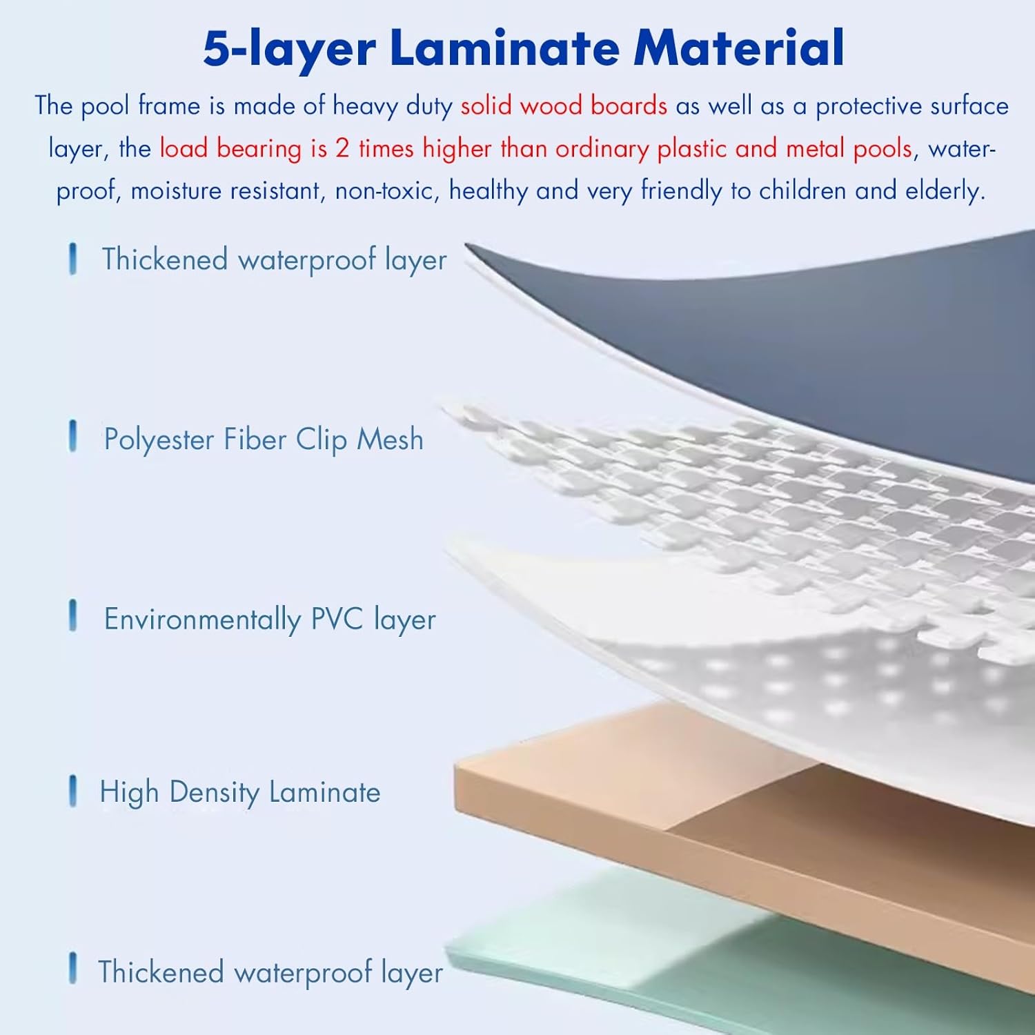 - ♨【Composite Wood】The swimming pool bracket is made of heavy-duty solid wood, which is lightweight and strong load-bearing, and the sides utilize a triangular stabilizing support structure that is not easy to roll over and is highly stable, load- bearing capacity of 200kg (440lbs), with PVC canvas surface layer so the pool can be used for a long period of time, avoiding the hassle of frequent replacements.