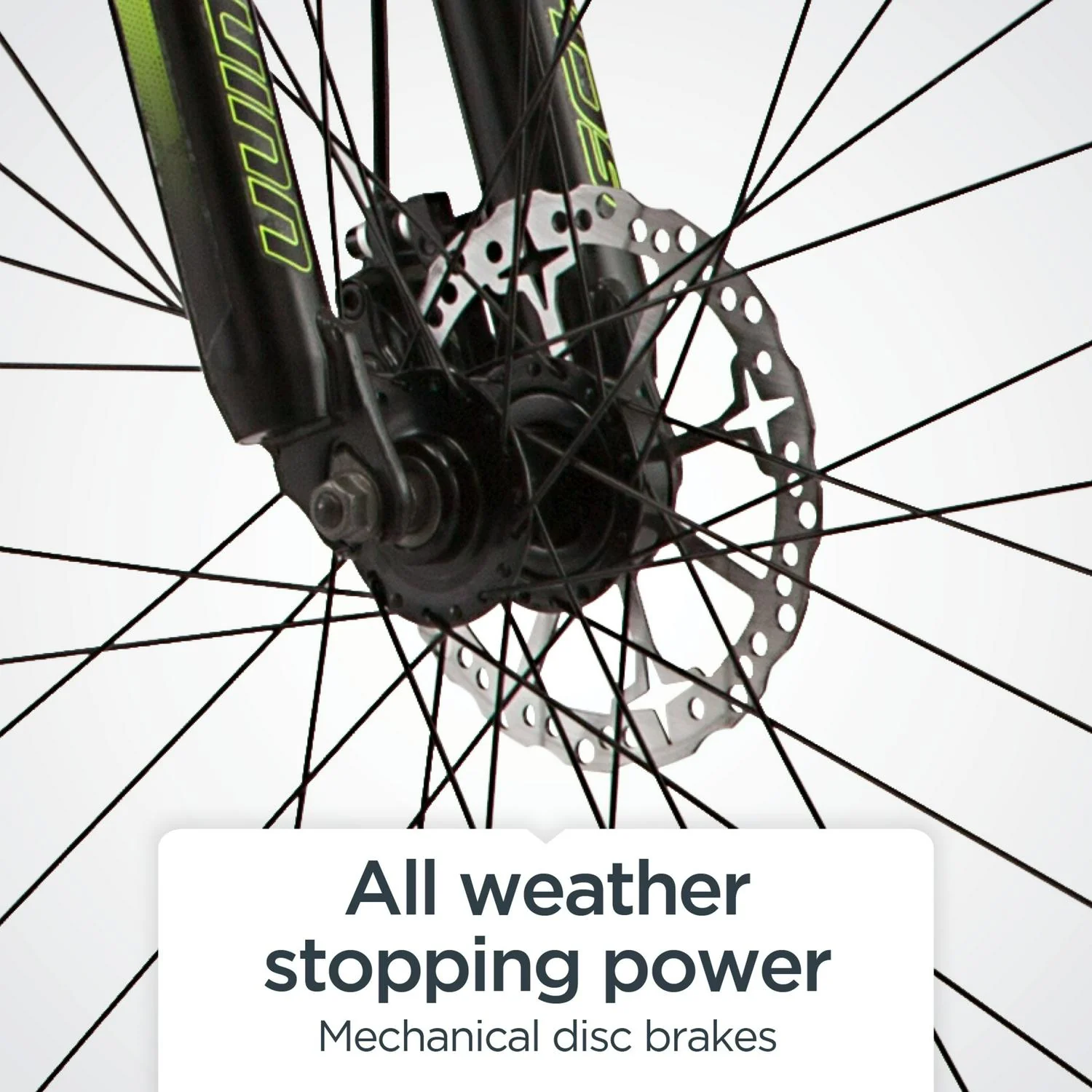 - Steel Schwinn mountain frame and front suspension fork for a durable . controlled ride.