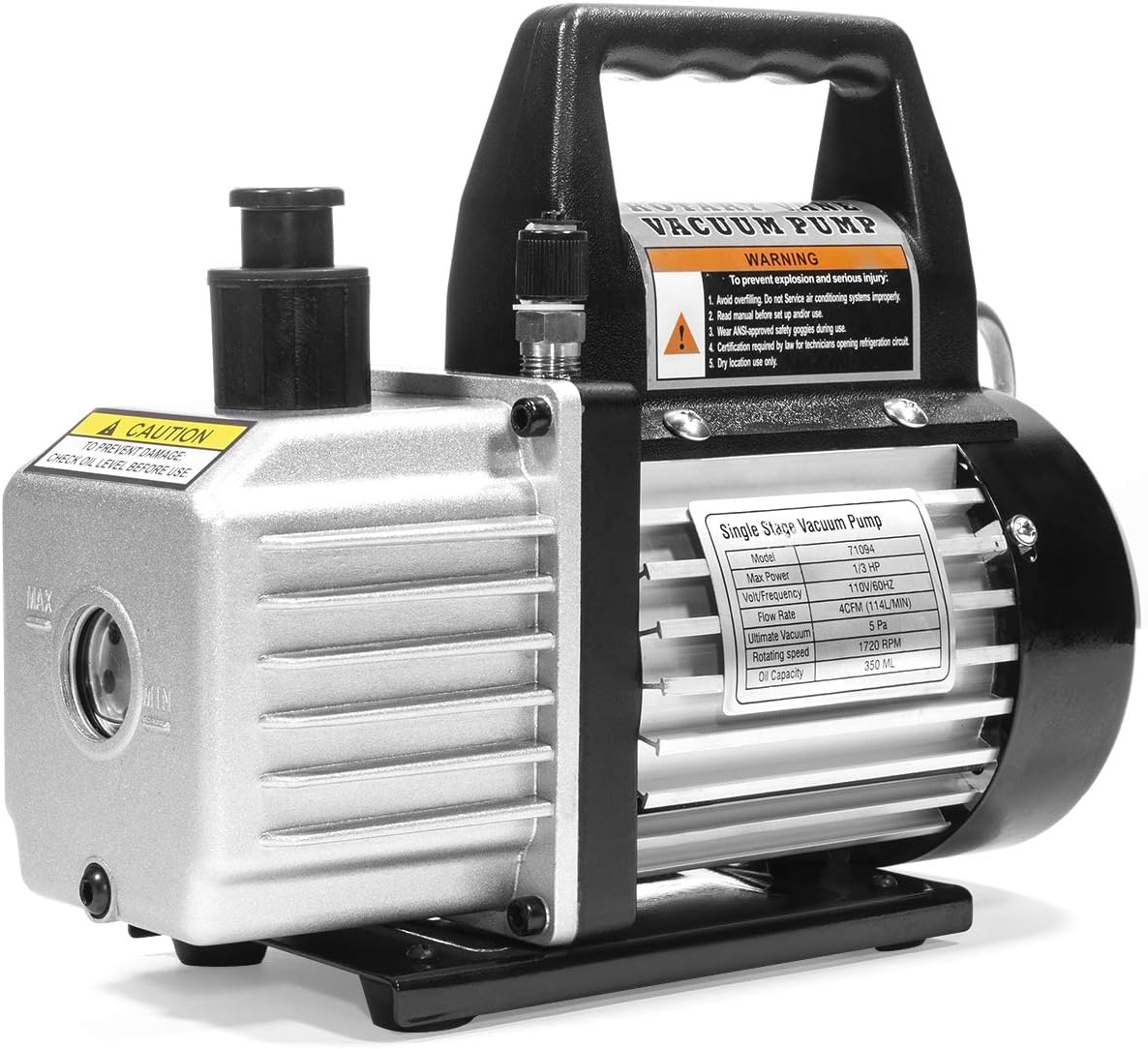 - SIMPLE BUT POWERFUL: 1/3 HP 4 CFM 1-Stage Rotary Air Vacuum Pump is designed to have high efficiency and low noise output with internal high volume cooling fan for extended use