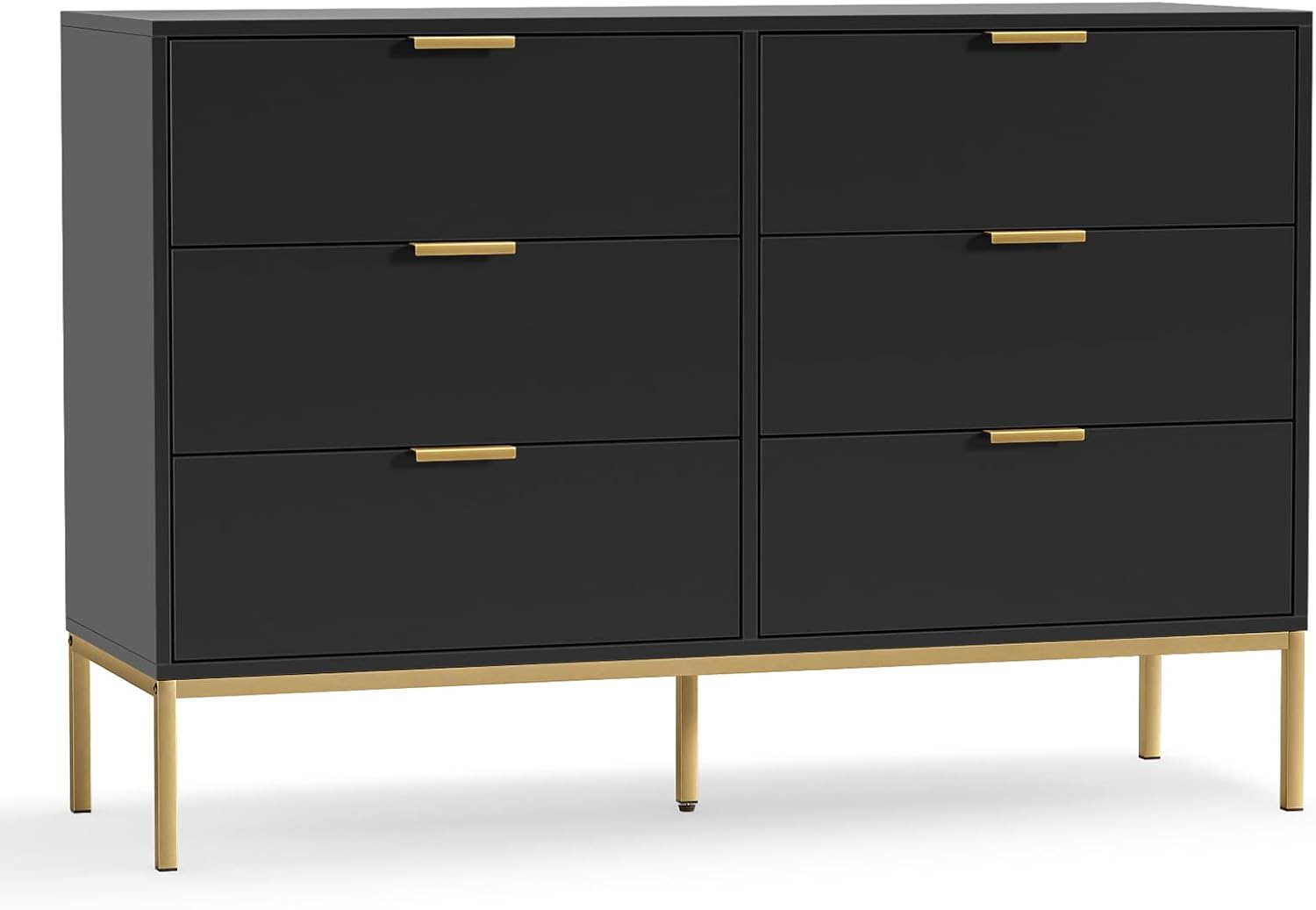 Black Dresser for Bedroom, Modern 6 Drawer Dresser, Chest of Drawers Closet Organizers and Wood Storage Clothes, White Dresser with Golden Handles for Living Room, Hallway