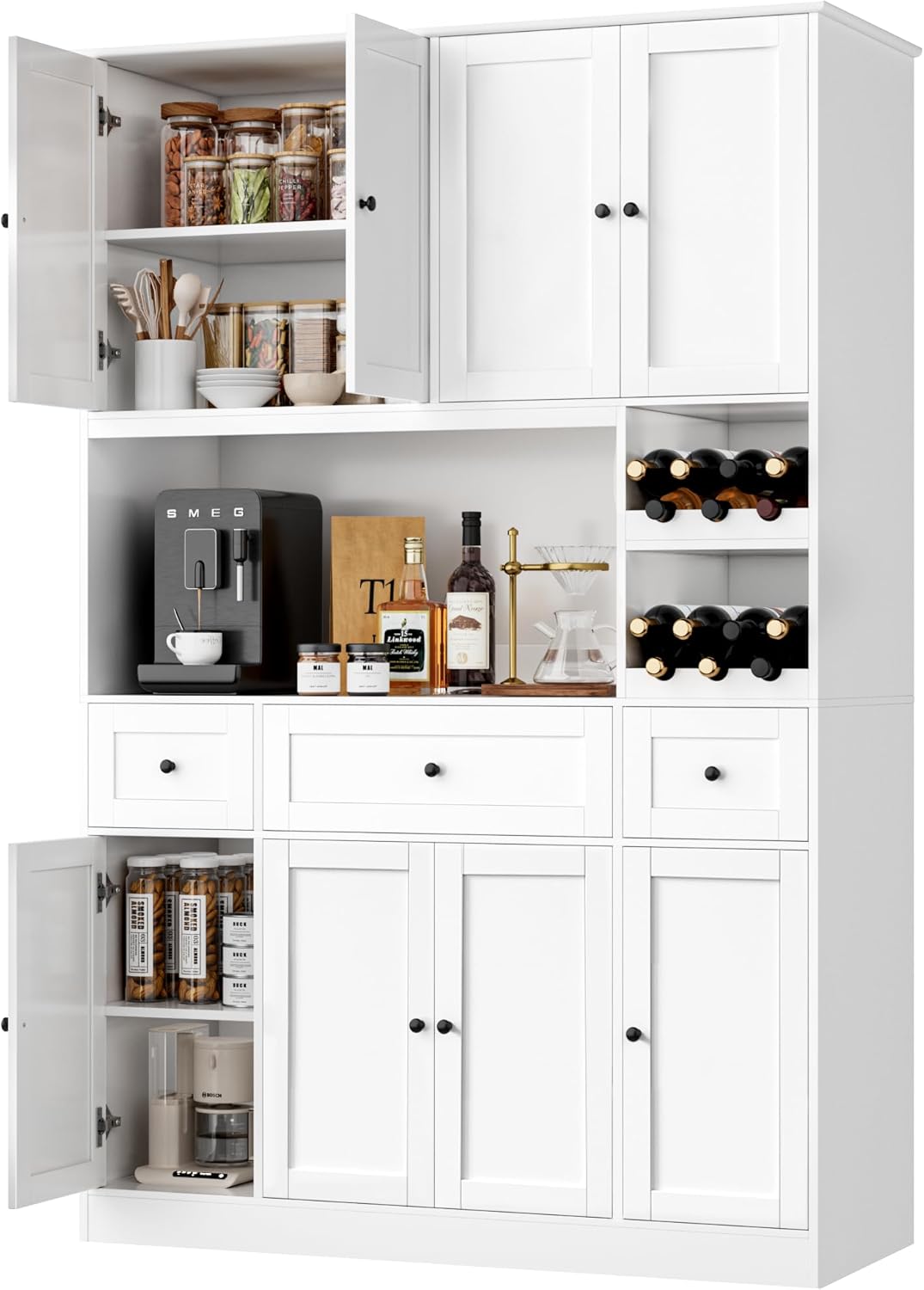 72" Tall Kitchen Pantry with Wine Rack, Pantry Cabinet with Microwave Stand, Large Hutch with Ample Storage, Hutch Cabinet for Kitchen, Dining, Living Room, White