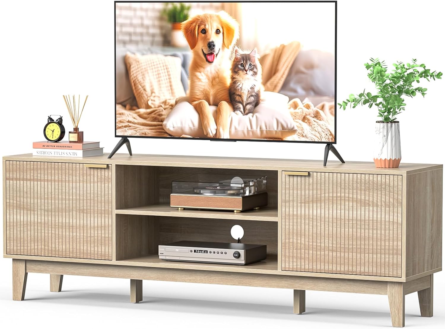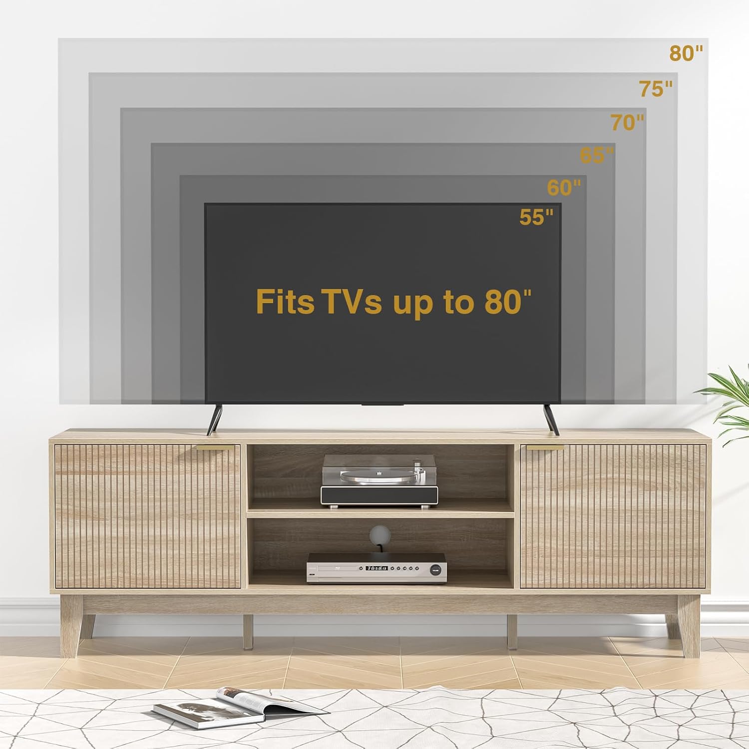 70" TV Stand for Living Room, Fluted Mid-Century Modern TV Console for TVs up to 80 inch, Farmhouse Entertainment Center with 2 Storage, Media Console Table for Living Room, Oak
