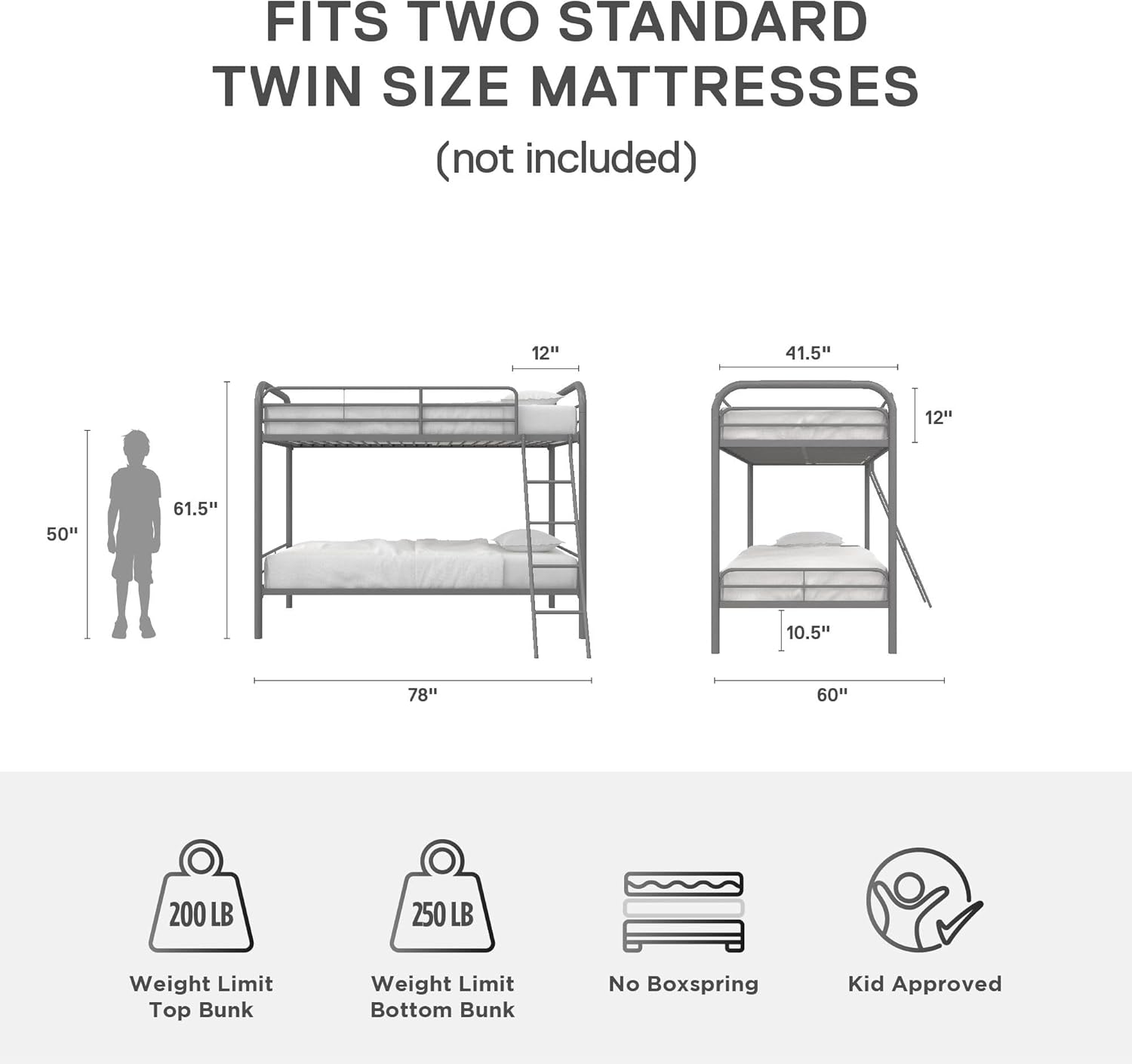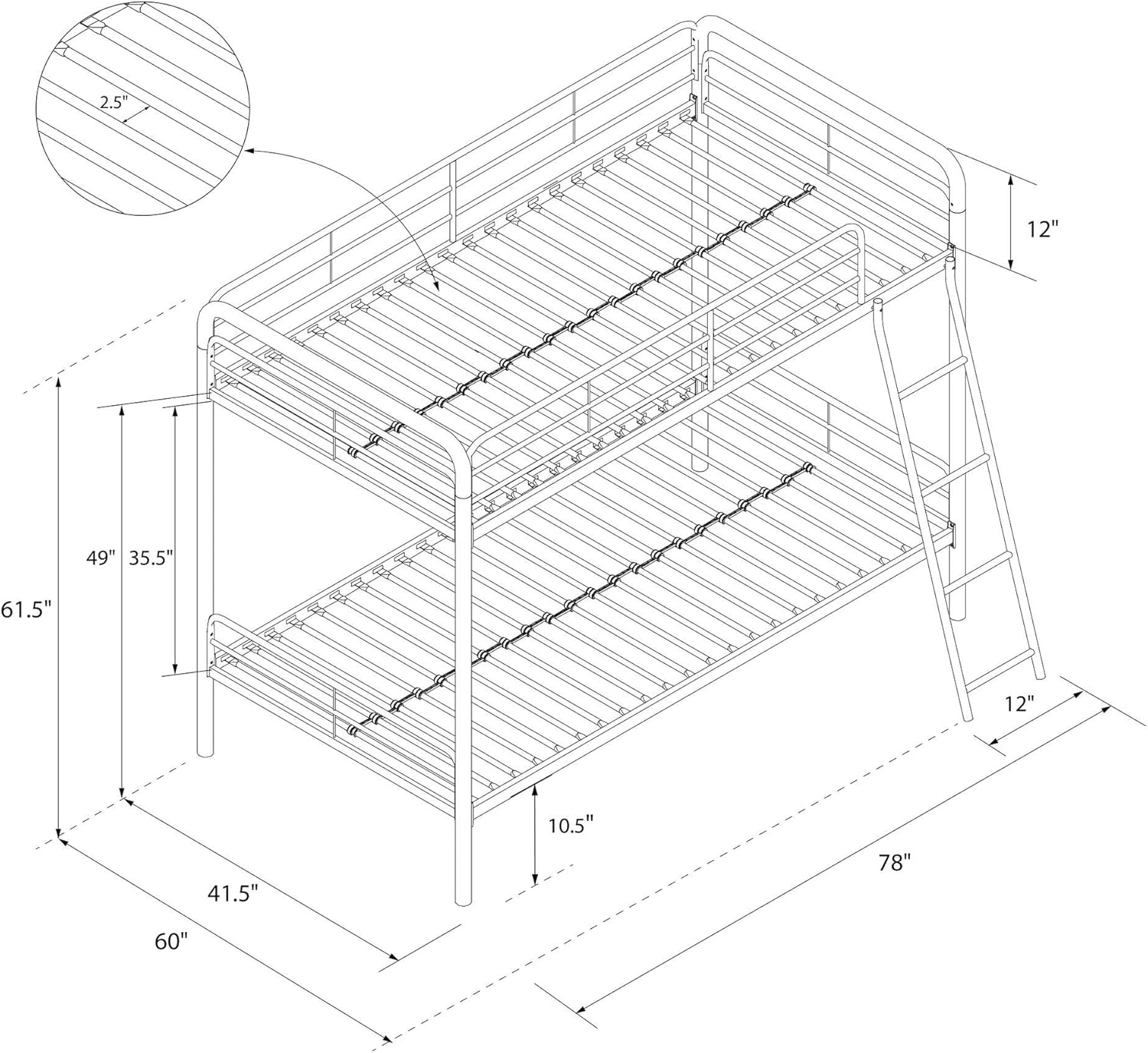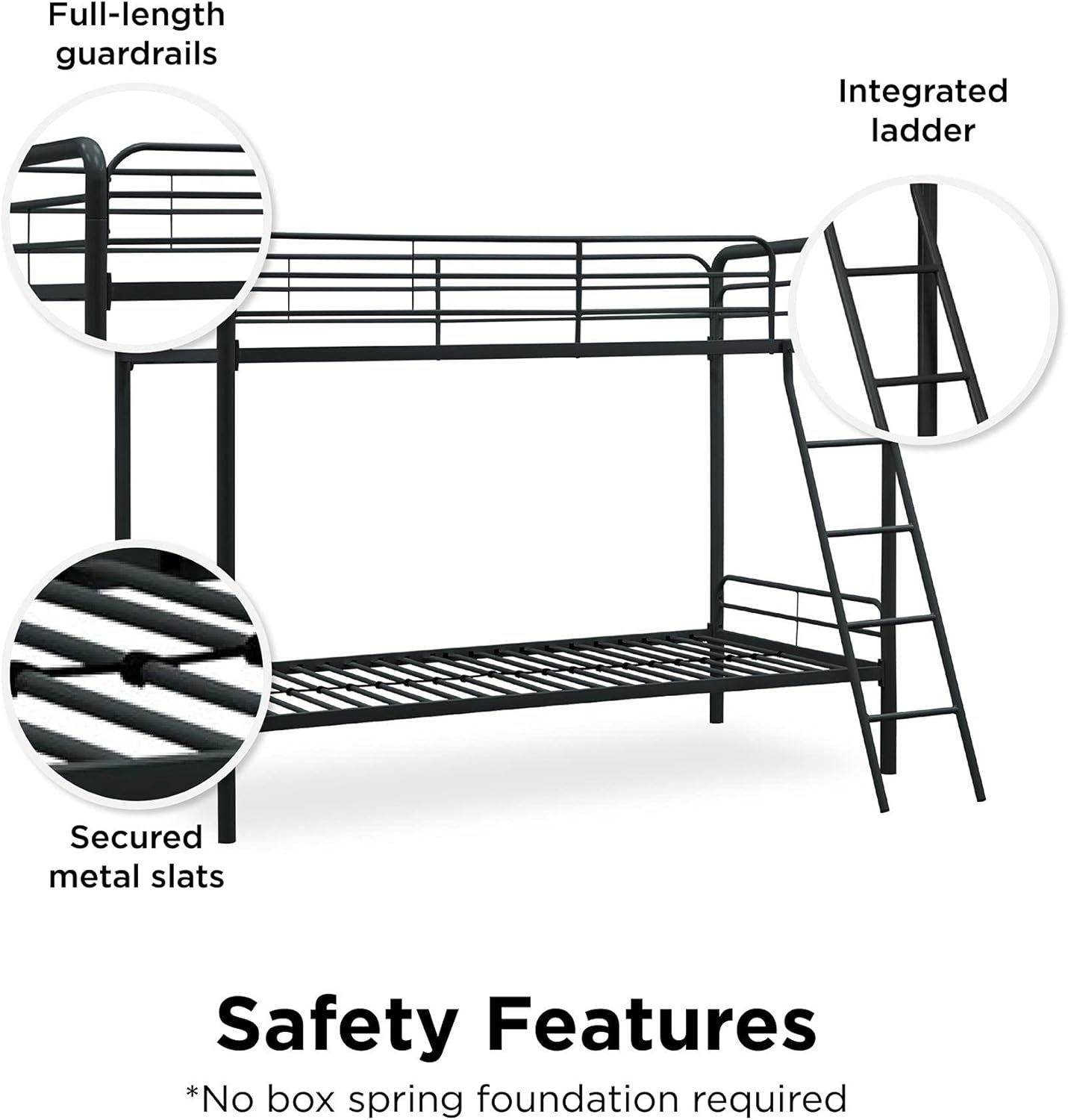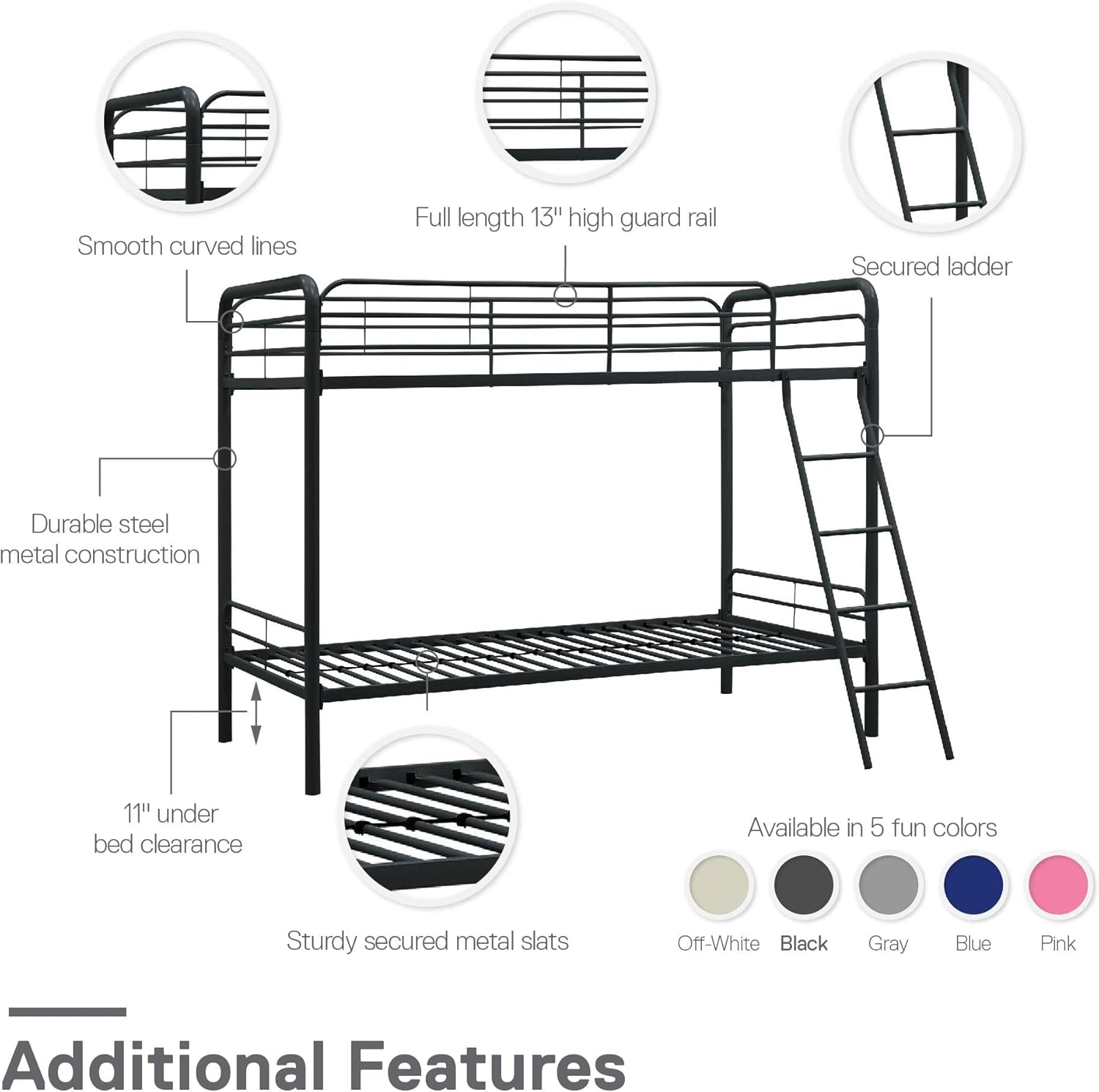 • Its durable steel metal frame construction includes sturdy secured metal slats spaced 2.5 inches apart for complete mattress support, full-length 13-inch height safety guard rails around the top bunk, and 2 safe integrated ladders for easy up and down access from either side. Box spring not required.