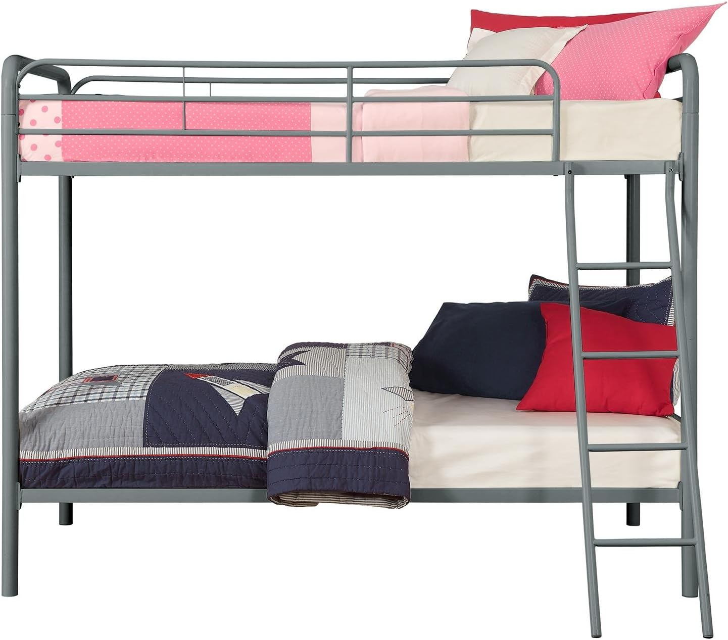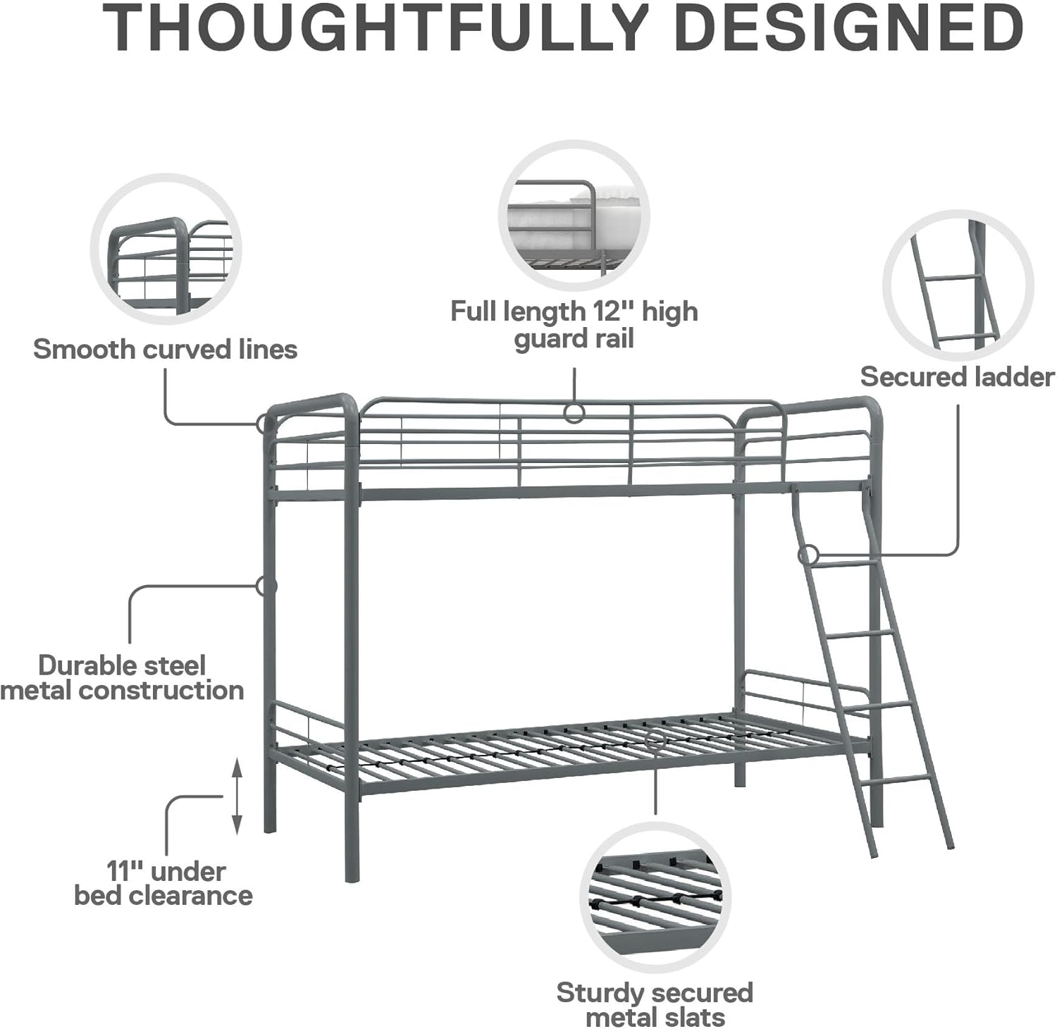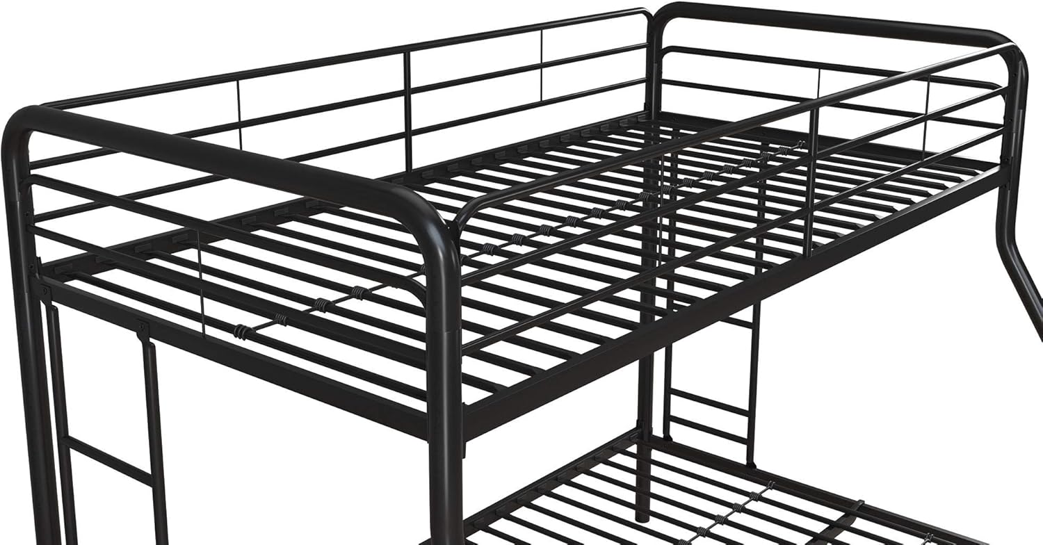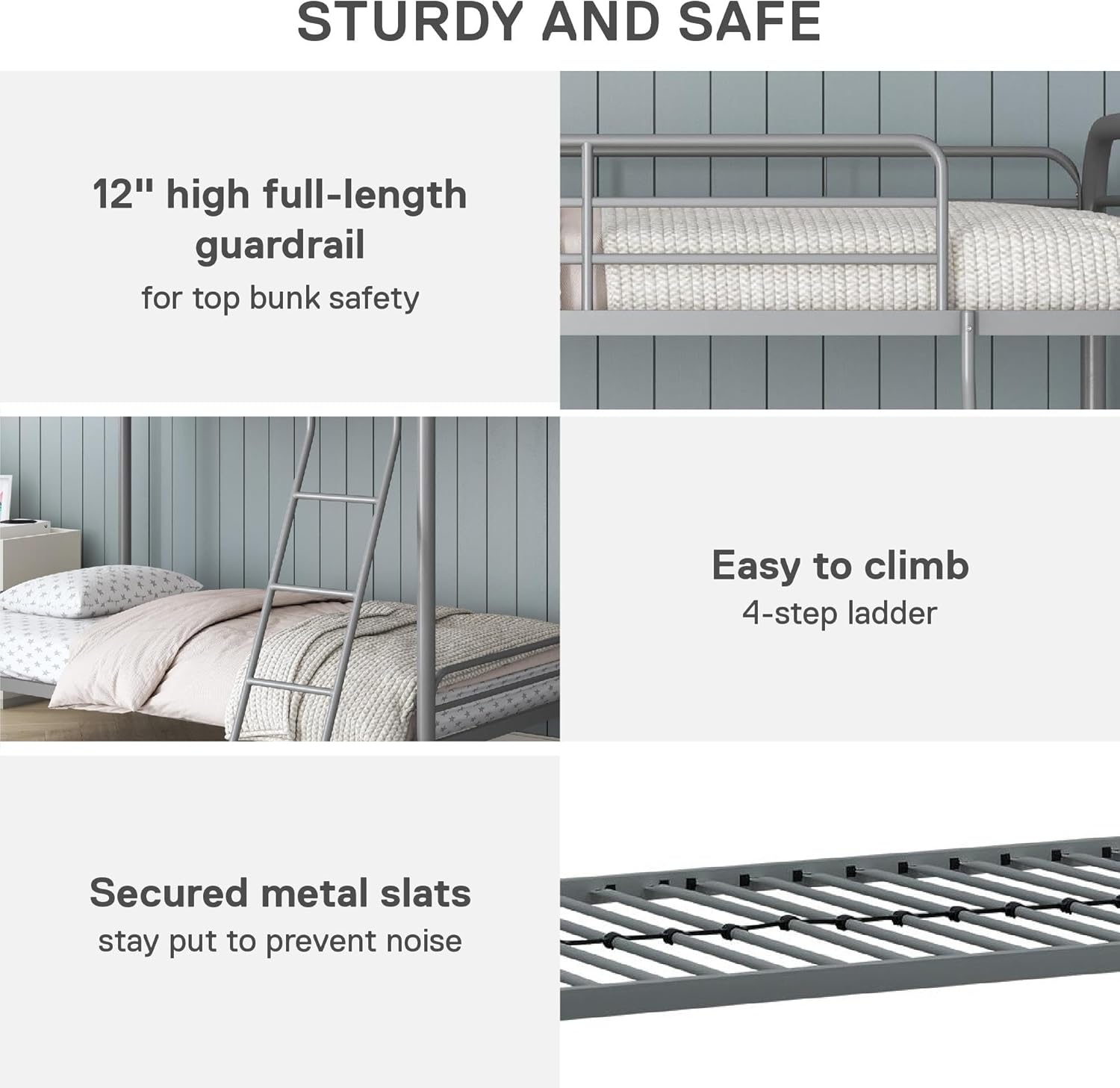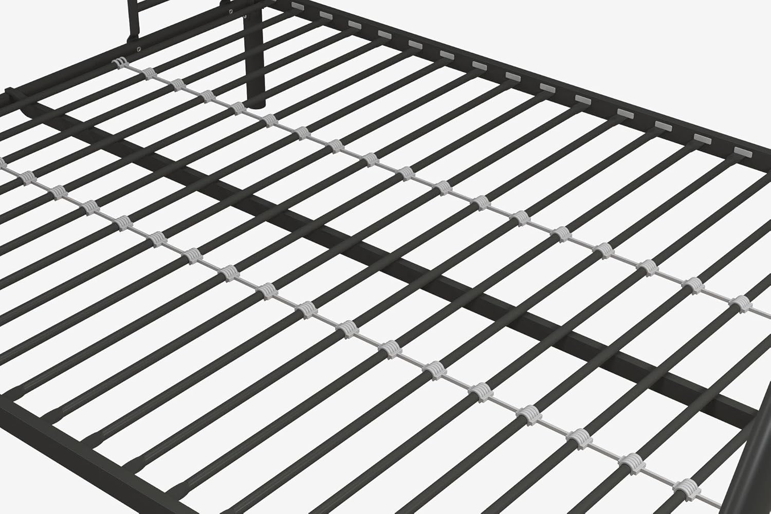 • Its durable steel metal frame construction includes sturdy secured metal slats spaced 2.5 inches apart for complete mattress support, full-length 13-inch height safety guard rails around the top bunk, and 2 safe integrated ladders for easy up and down access from either side. Box spring not required.