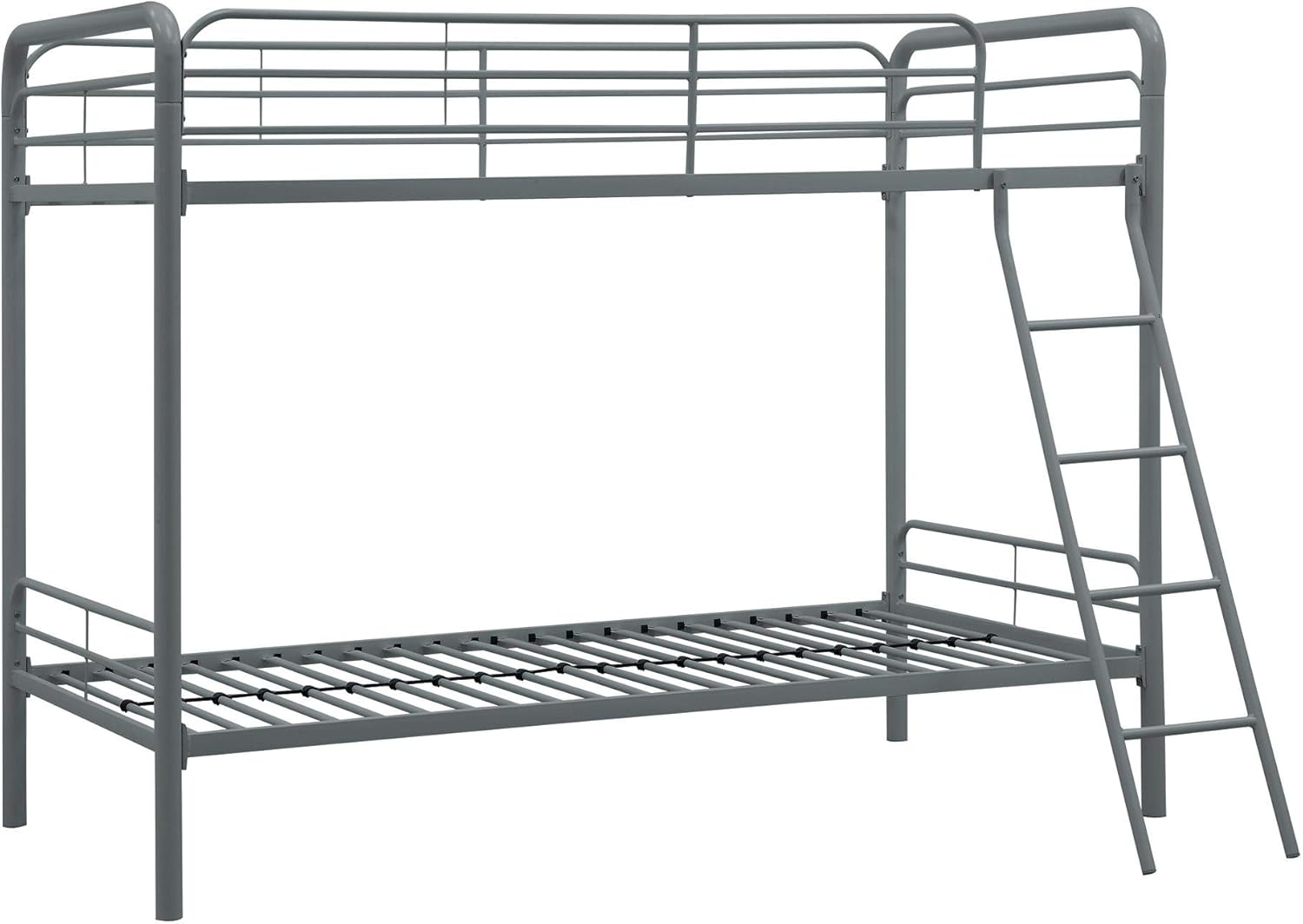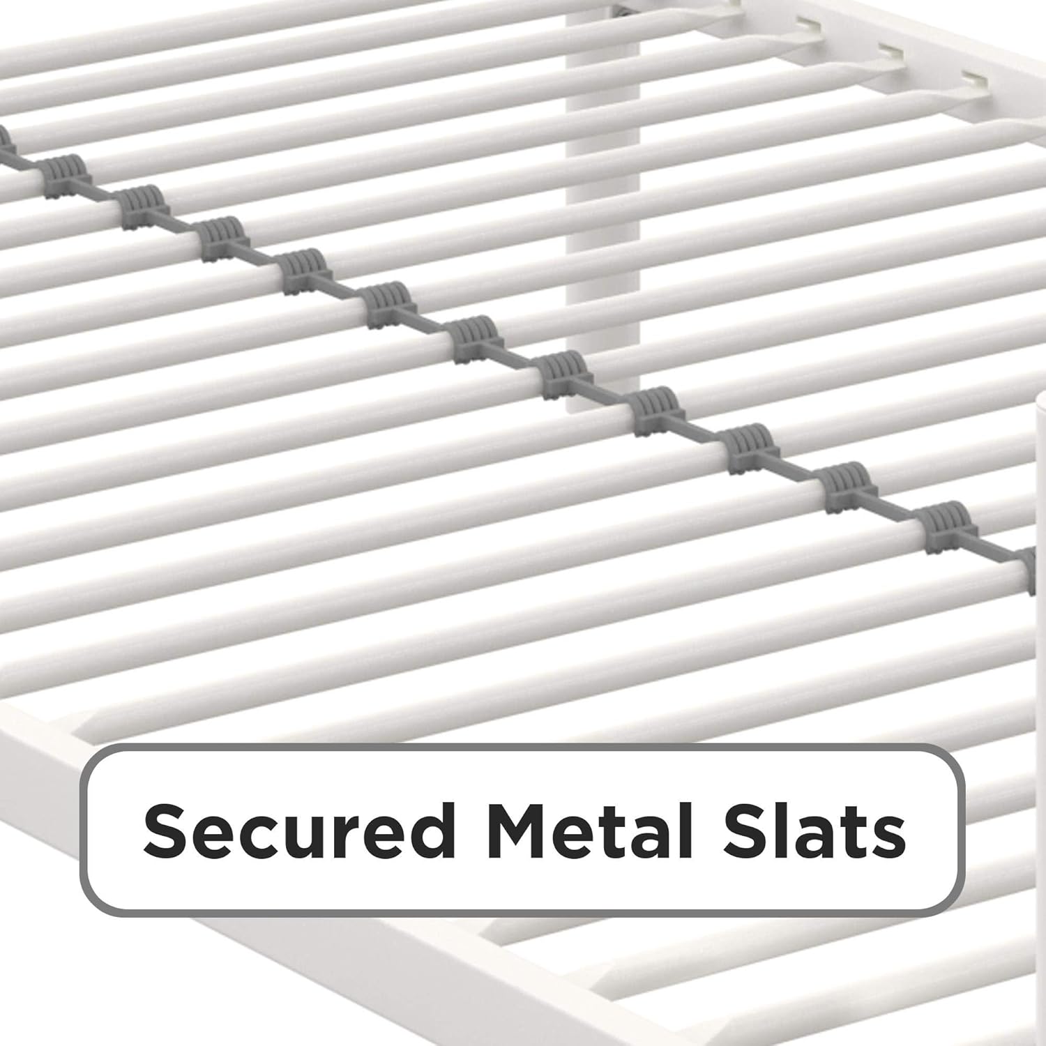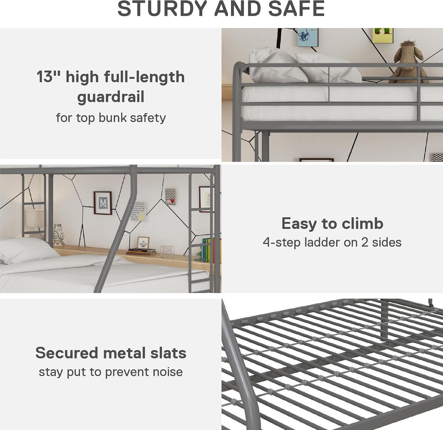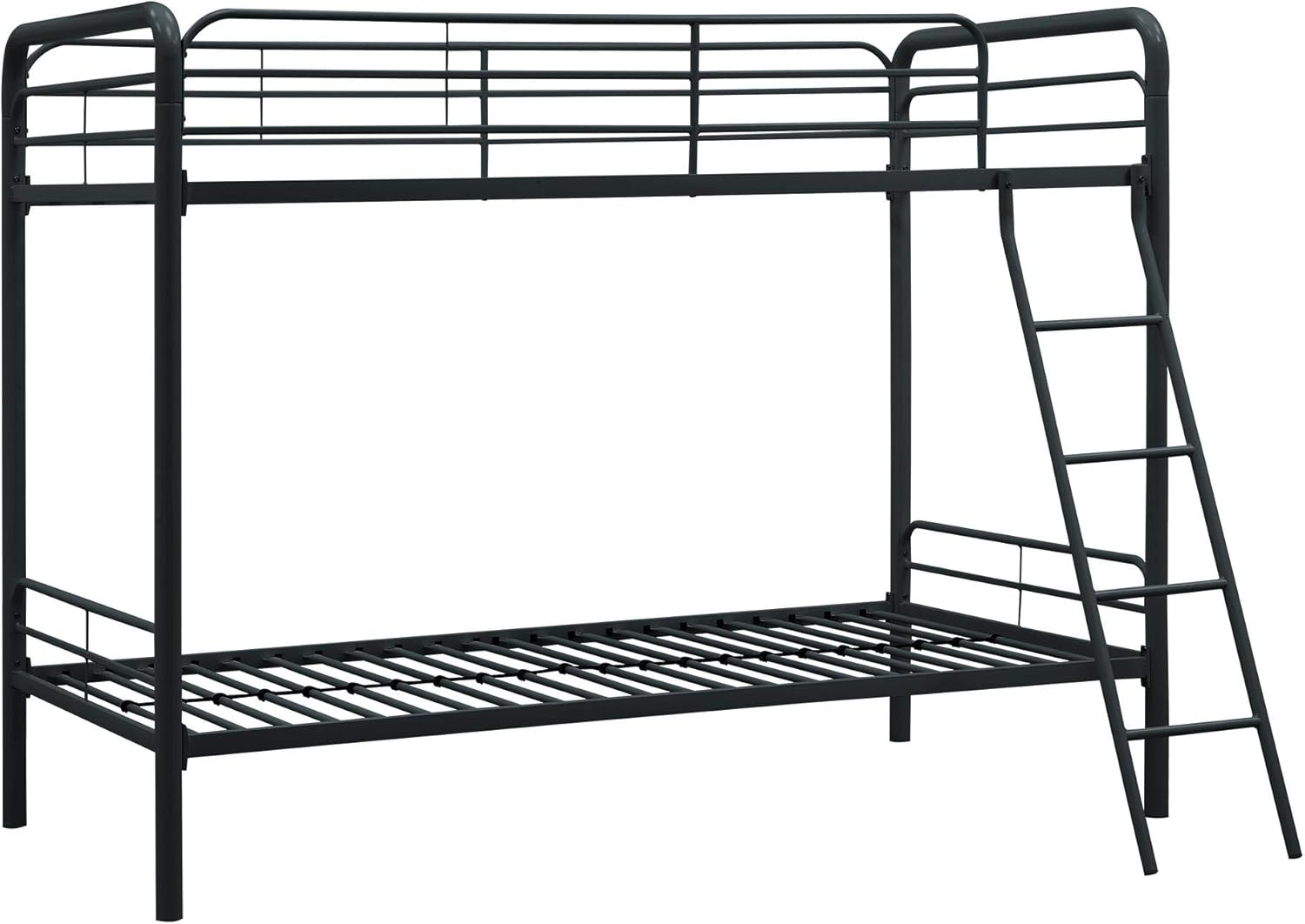 • Its durable steel metal frame construction includes sturdy secured metal slats spaced 2.5 inches apart for complete mattress support, full-length 13-inch height safety guard rails around the top bunk, and 2 safe integrated ladders for easy up and down access from either side. Box spring not required.