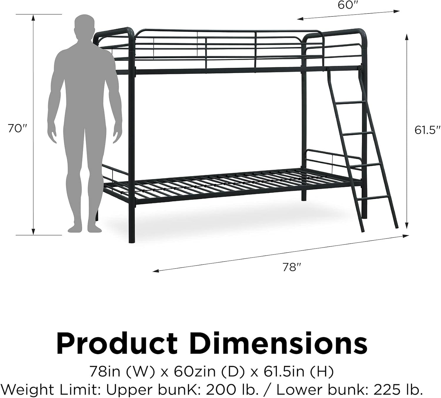 • Assembled Dimensions: 78"L x 56.5"W x 61.5"H; weight 84.5 lbs. Weight limit: upper bunk 200 lbs., lower bunk 350 lbs. 1-year limited warranty. Thickness of upper bunk mattress should not exceed 6 inches (mattresses not included)