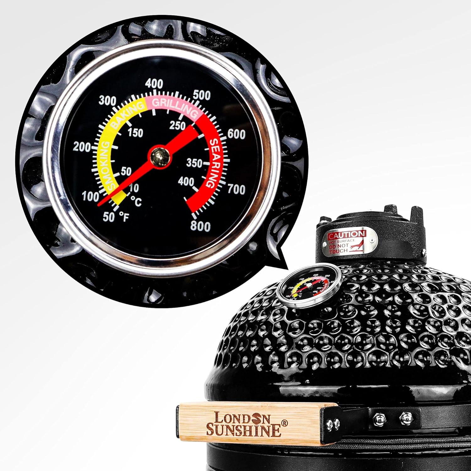 - Specially Made For BBQ Lovers - High rang cooking temperature 180°F~750°F(82°C~399°C) allows it to do all the BBQ cooking in Smoking, Low Cooking, Baking, Grilling and Broiling. The thick ceramic wall insulate the heat inside evenly distributed inside Kamado that locks all the flavor and moist inside that brings out the best flavor from lump charcoal and spices, and making juicy tender meat that you desired for.